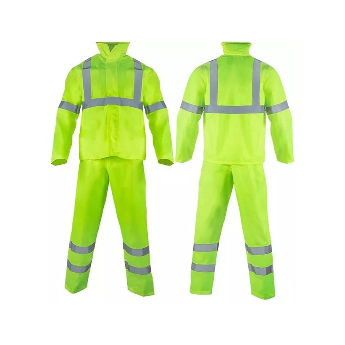 • Features Lightweight fabric|Reflective bands,Elasticated waist on trousers,Heavy duty zipper front on jacket|Front flap pockets on jacket|Taped seams|Adjustable ankle poppers.